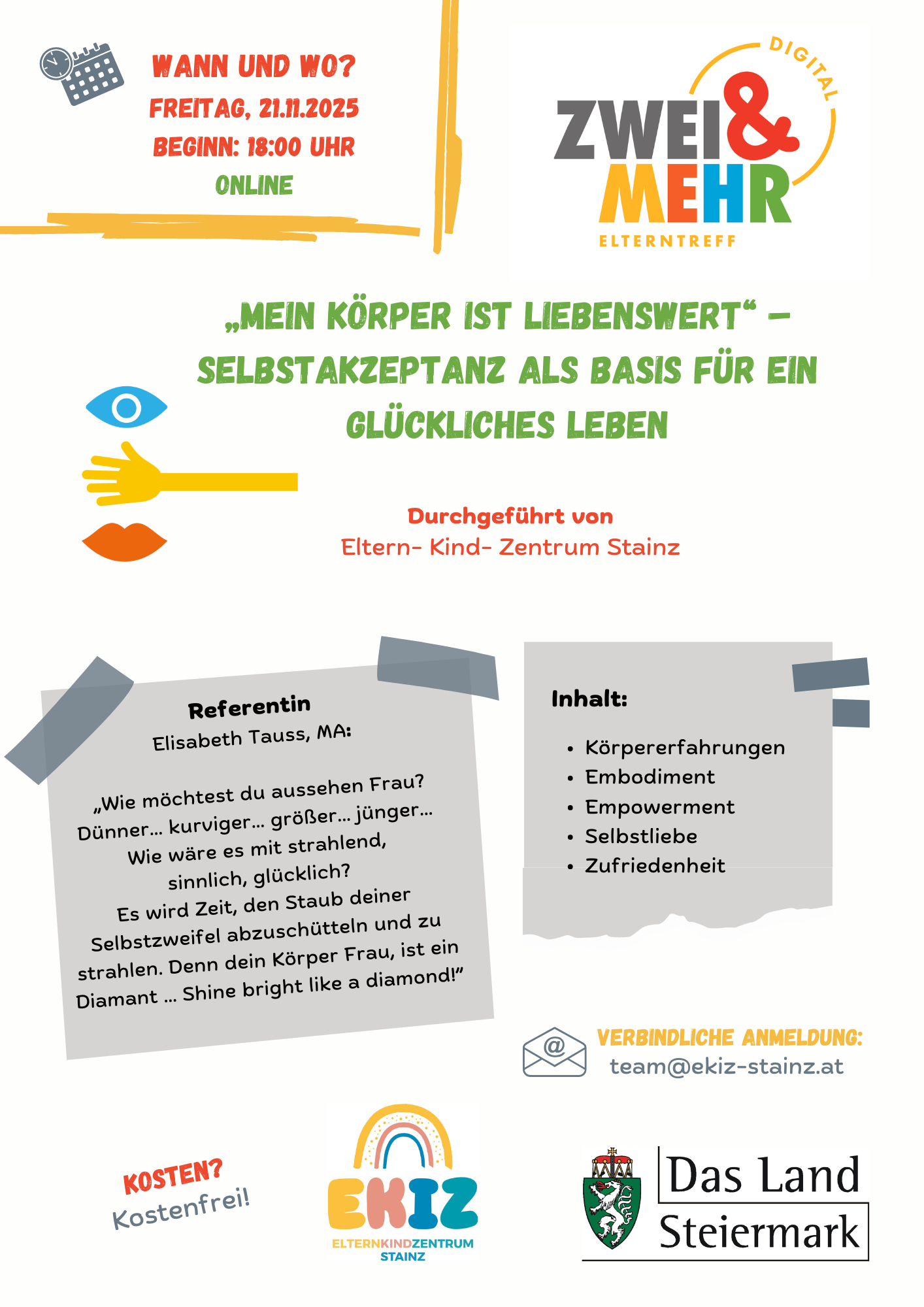 Bitte um verbindliche Anmeldung an team@ekiz-stainz.at, alle weiteren Details zur Online-Teilnahme werden per E-Mail übermittelt.