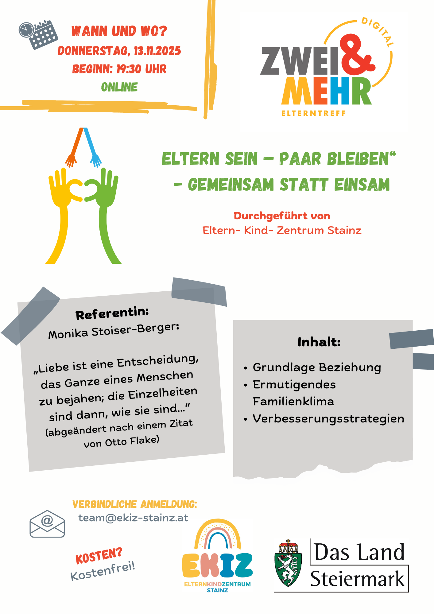 Bitte um verbindliche Anmeldung an team@ekiz-stainz.at, alle weiteren Details zur Online-Teilnahme werden per E-Mail übermittelt.