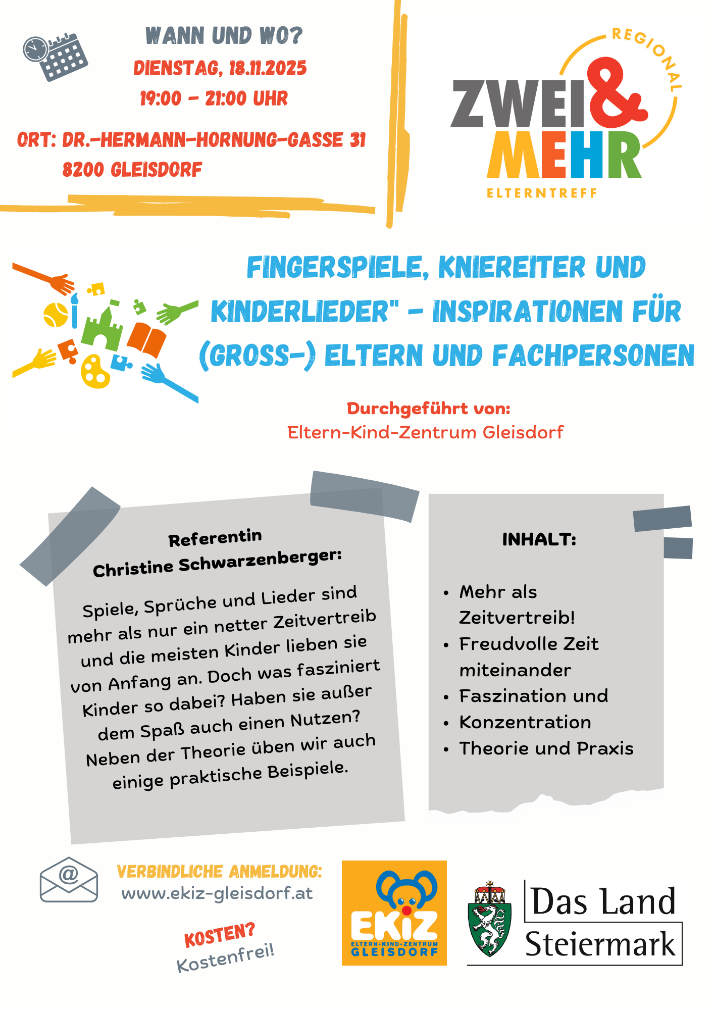 ZWEI & MEHR-Elterntreff Gleisdorf: "Fingerspiele, Kniereiter und Kinderlieder"