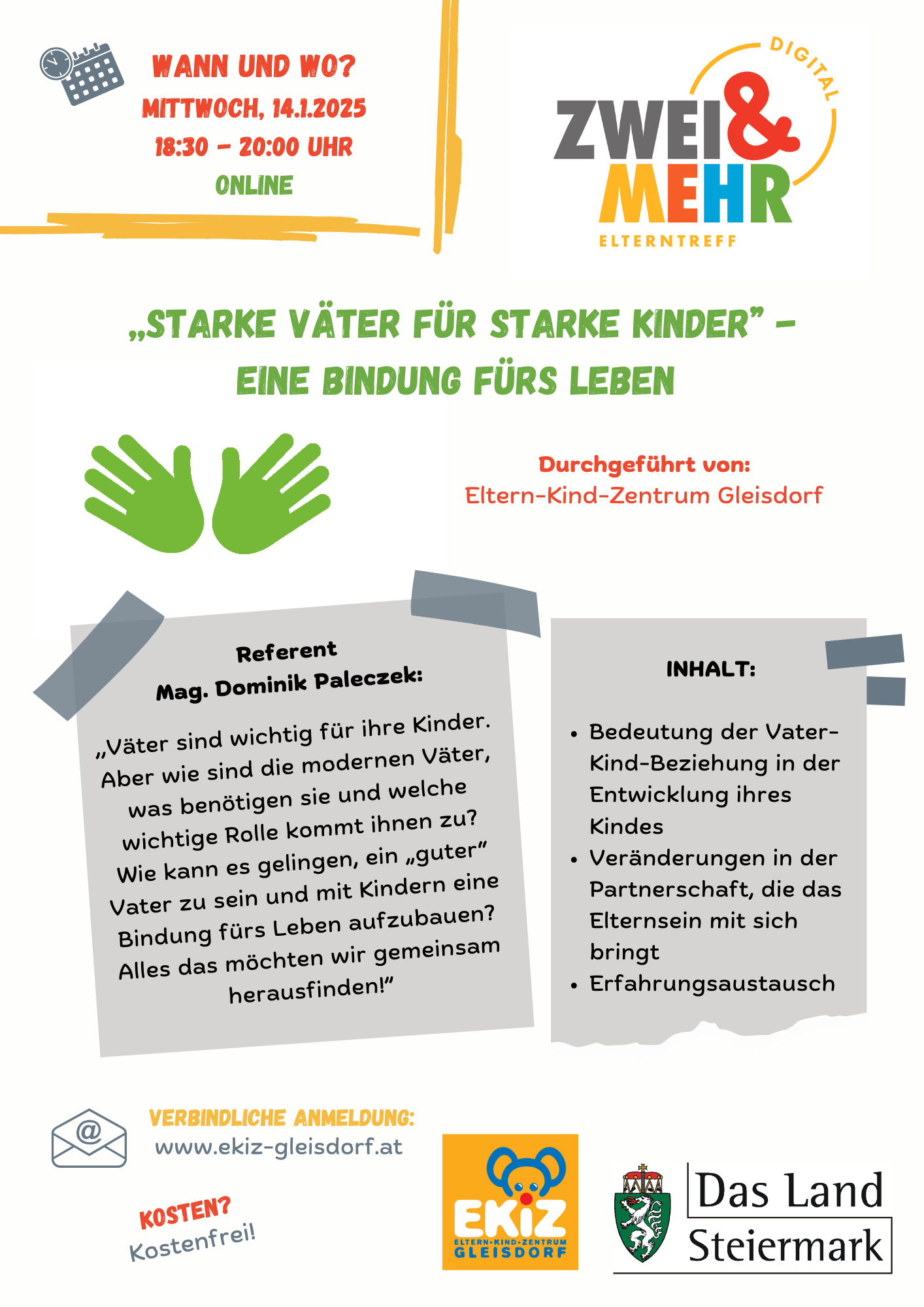 Die Online-Veranstaltung ist kostenfrei für alle (werdenden) Eltern, Bezugspersonen und Interessierten und wird nach angemeldetem Bedarf (spätestens eine Woche vor der Veranstaltung) in Gebärdensprache übersetzt. Bitte senden Sie Ihre Anmeldung an kontakt@ekiz-gleisdorf.at, alle weiteren Details zur Online-Teilnahme werden per Mail übermittelt.