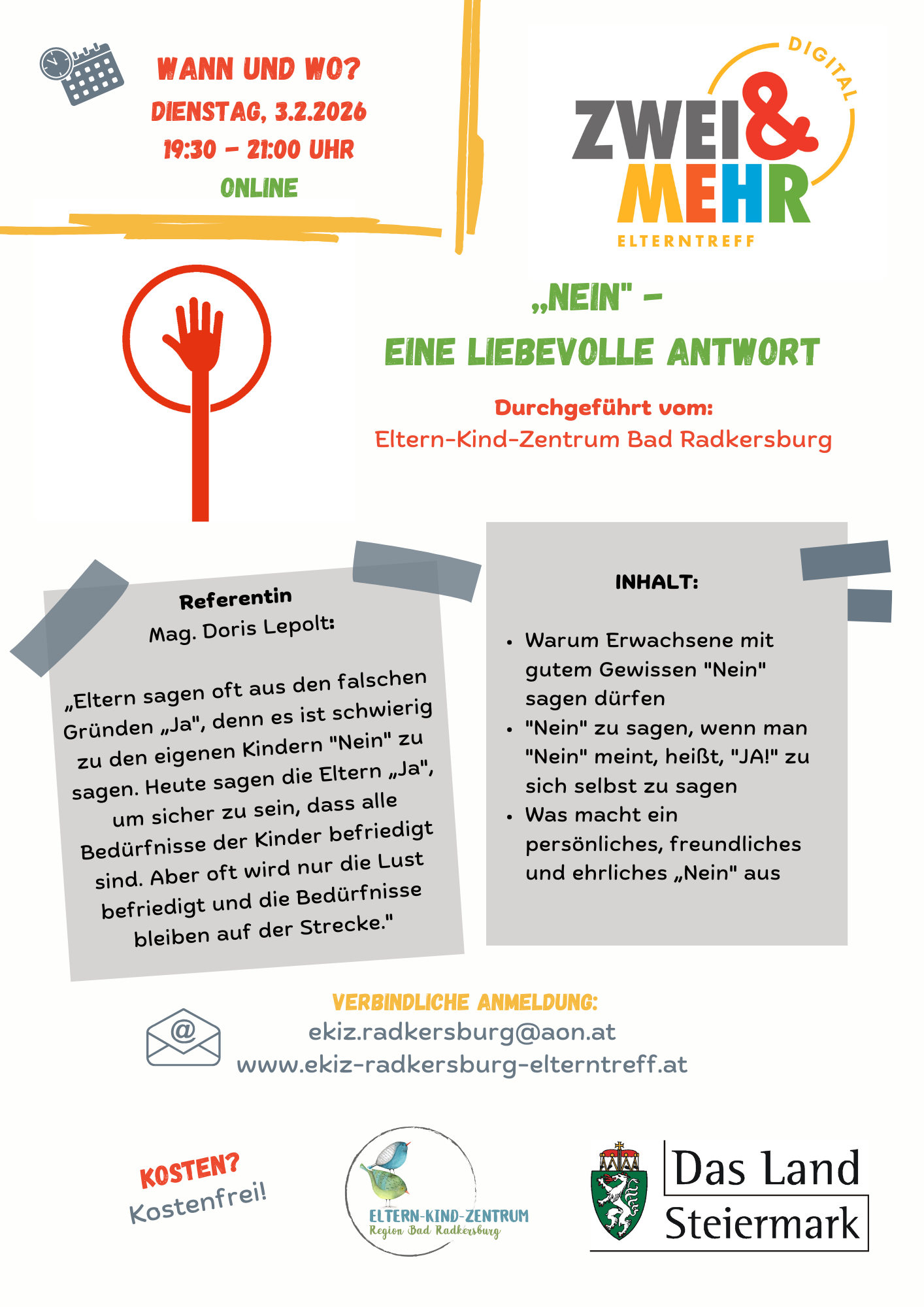 Bitte um verbindliche Anmeldung an ekiz.radkersburg@aon.at, alle weiteren Details zur Teilnahme werden per E-Mail übermittelt.