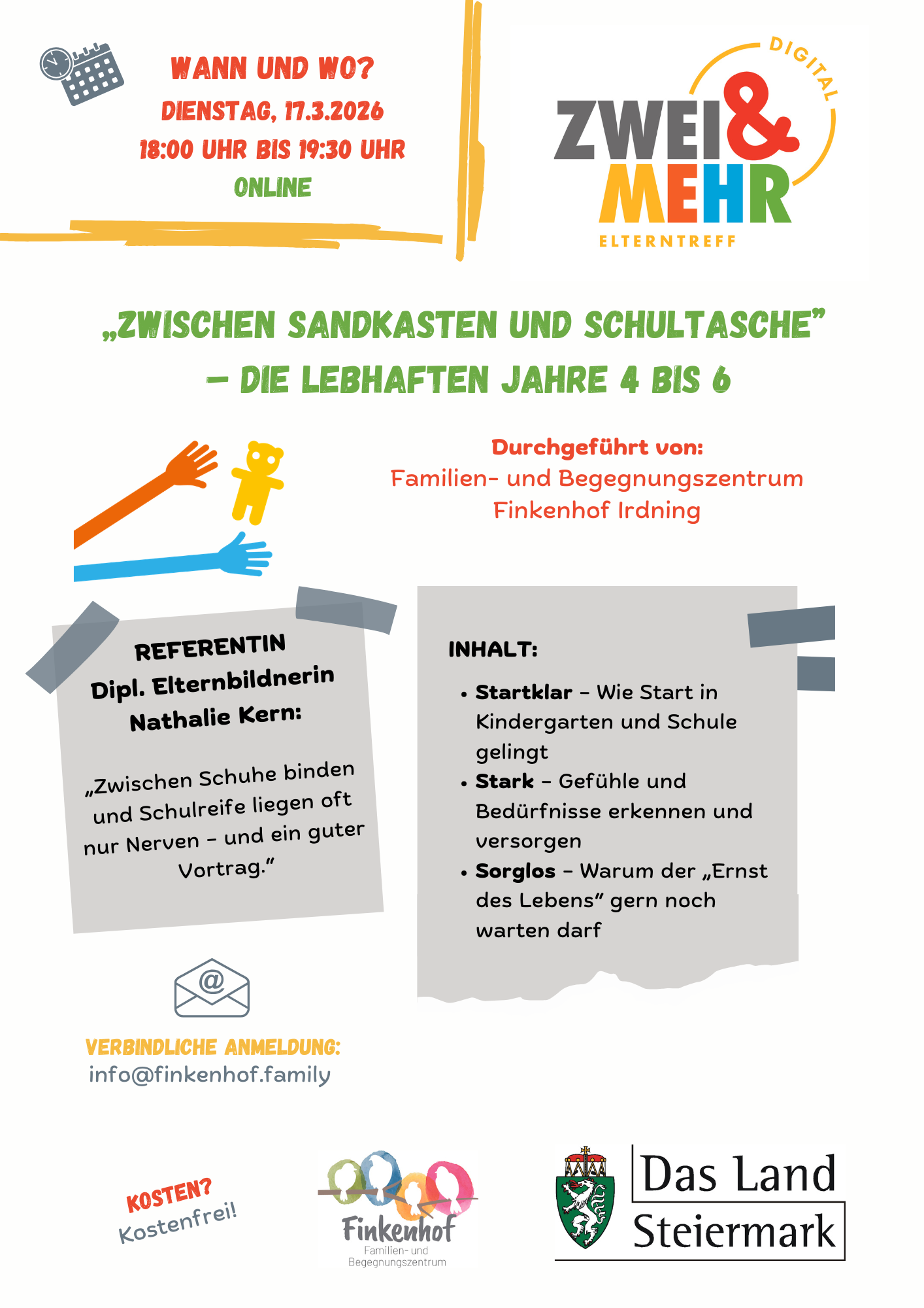 ZWEI & MEHR-Elterntreff online: "Zwischen Sandkasten und Schultasche" – Die lebhaften Jahre 4 bis 6