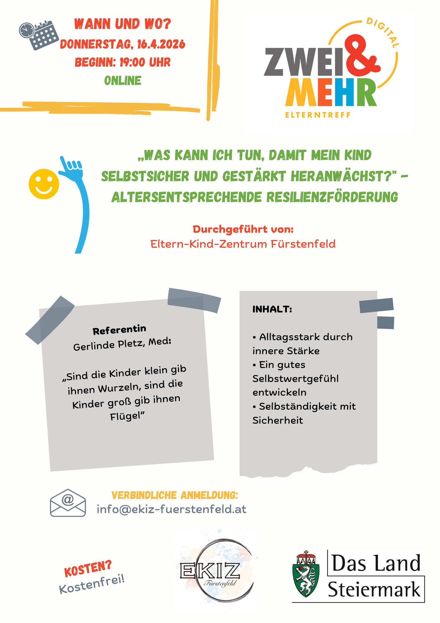 ZWEI & MEHR-Elterntreff online: "Was kann ich tun, damit mein Kind selbstsicher und gestärkt heranwächst?" - Altersentsprechende Resilienzförderung