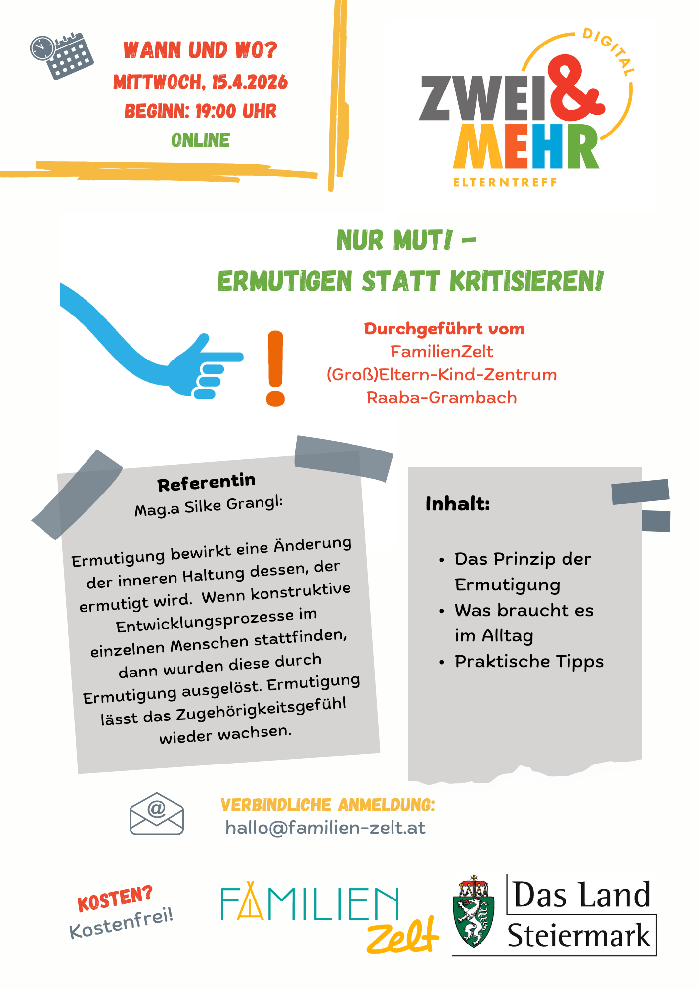 Bitte um Anmeldung beim FamilienZelt Raaba-Grambach unter hallo@familien-zelt.at. Alle weiteren Details zur Online-Teilnahme werden per Mail übermittelt.