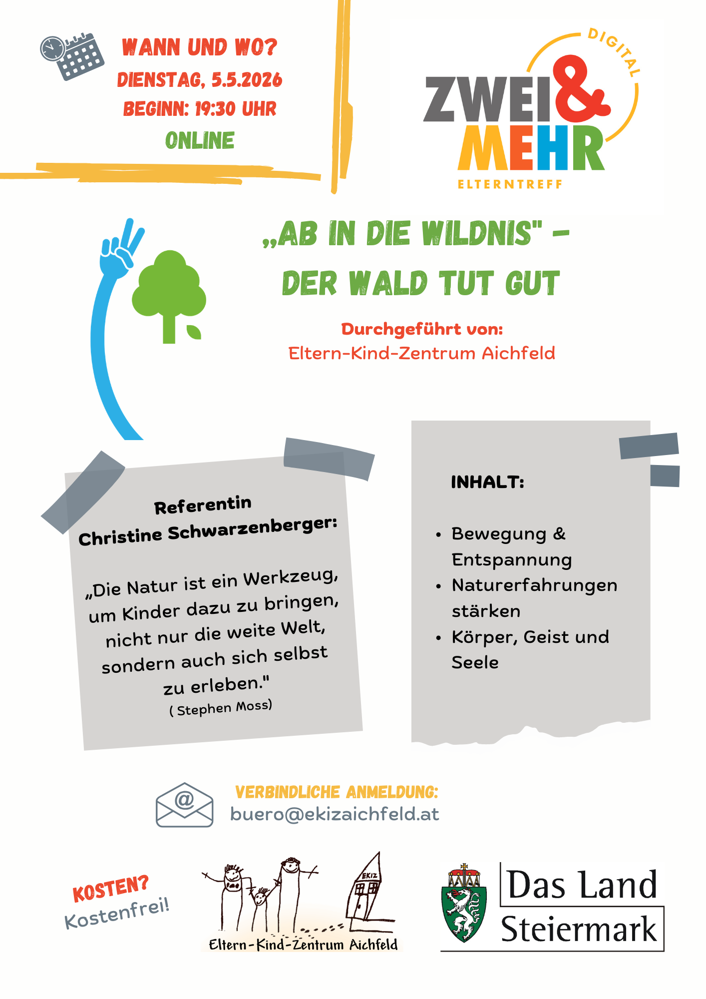Um verbindliche Anmeldung an die Mail-Adresse buero@ekizaichfeld.at wird ersucht, alle weiteren Details zur Online-Teilnahme werden per Mail übermittelt.