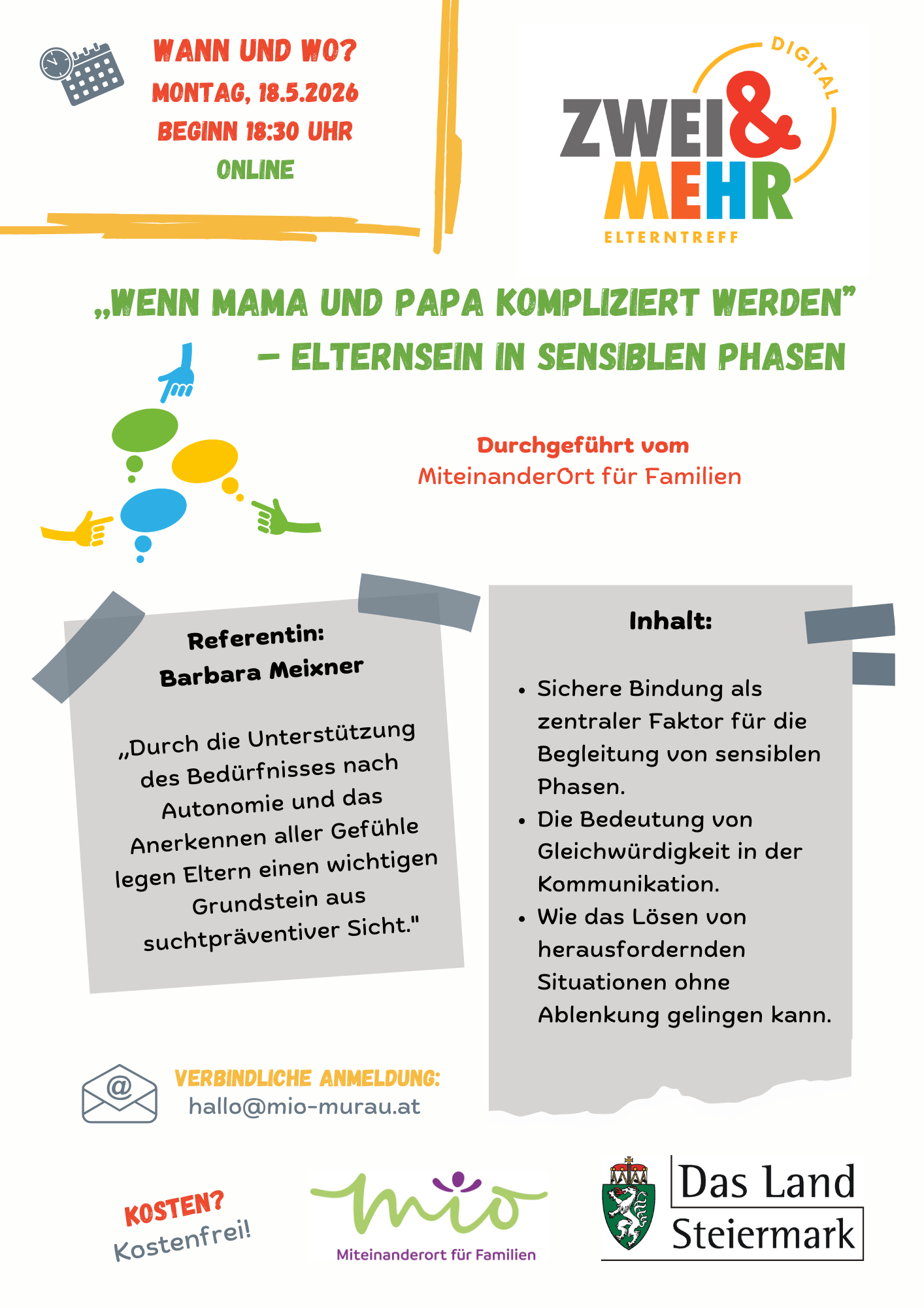 Die Online-Veranstaltung ist kostenfrei für alle (werdenden) Eltern, Bezugspersonen und Interessierten und wird nach angemeldetem Bedarf (spätestens eine Woche vor der Veranstaltung) in Gebärdensprache übersetzt. Bitte um Anmeldung beim MIO Murau unter hallo@mio-murau.at, alle weiteren Details zur Online-Teilnahme werden per Mail übermittelt.